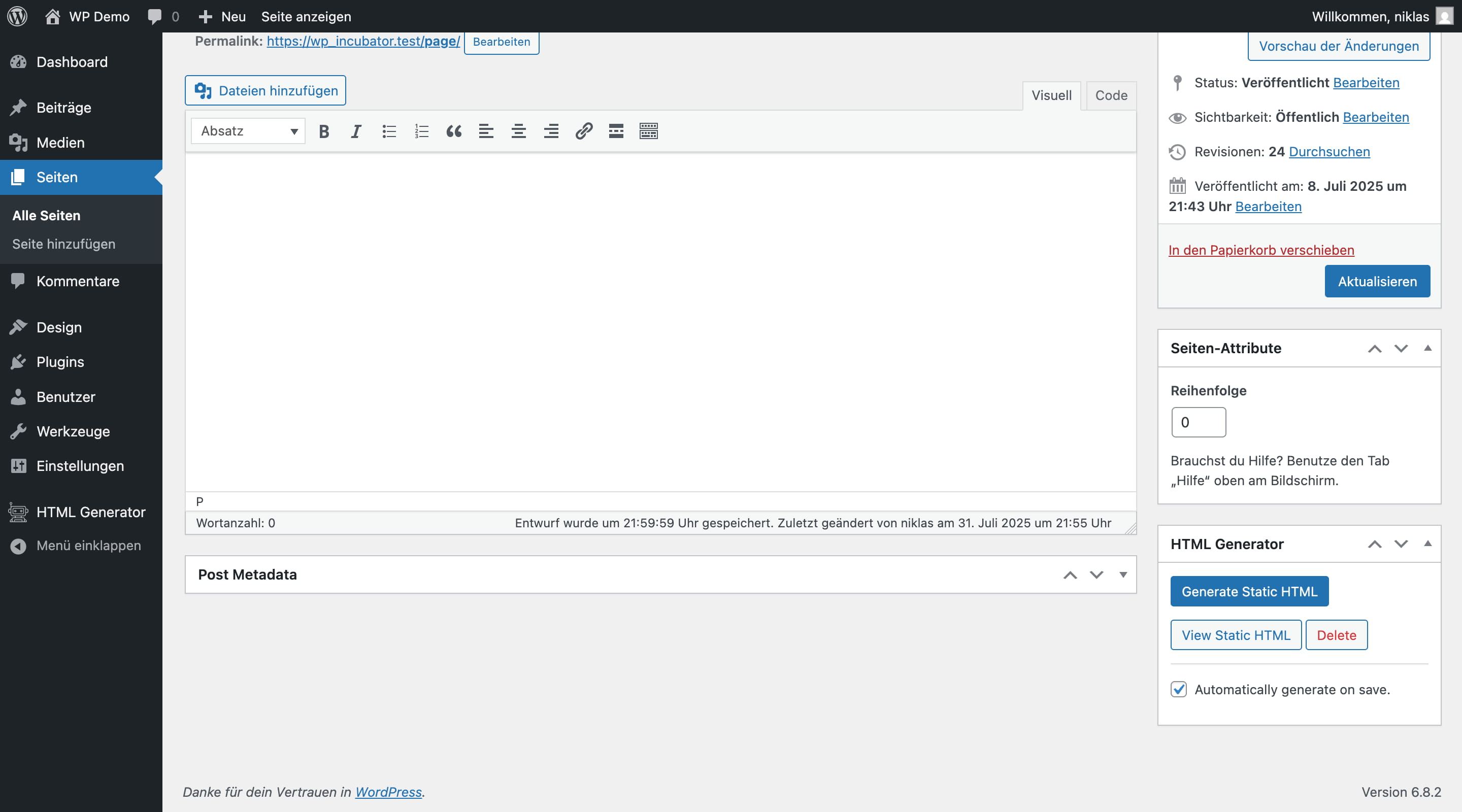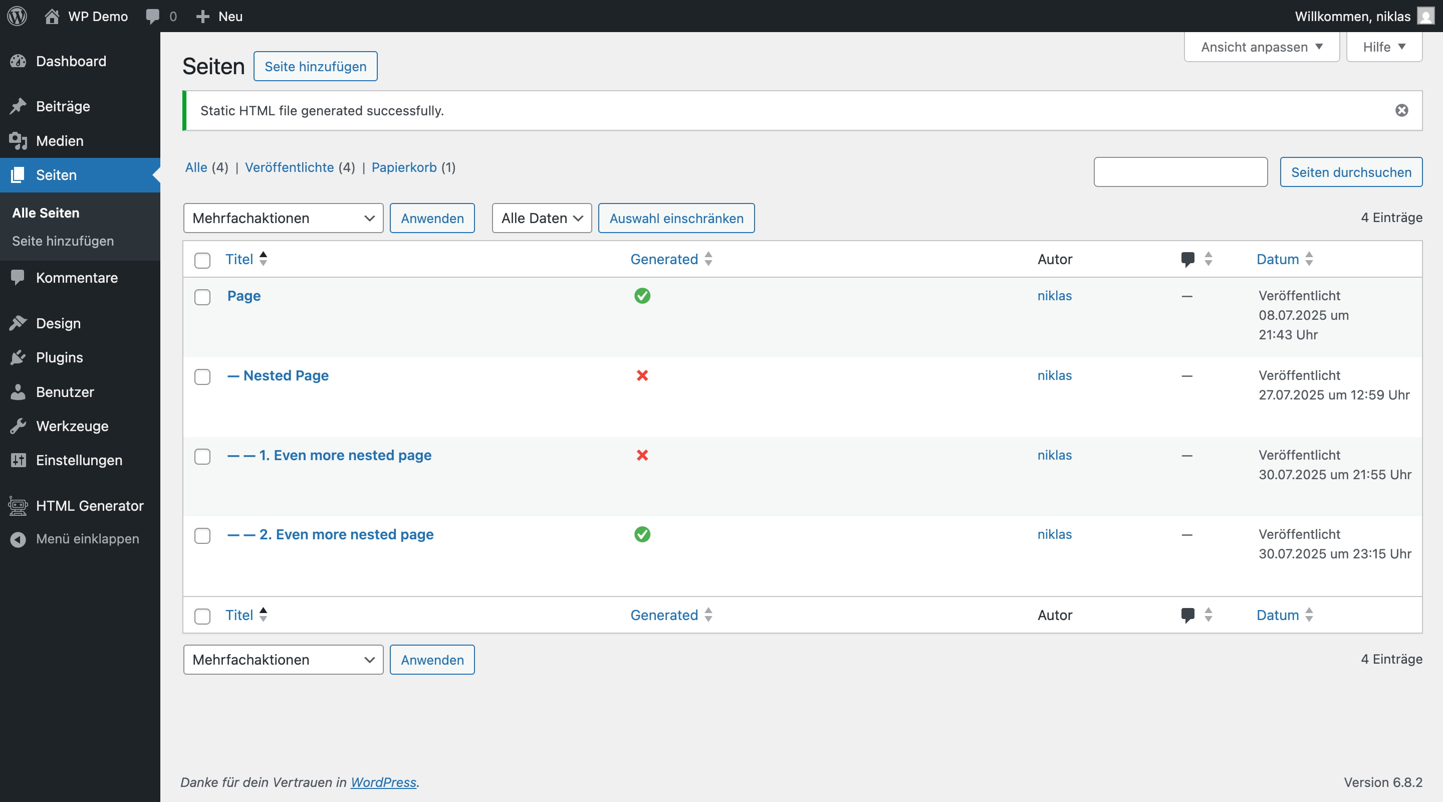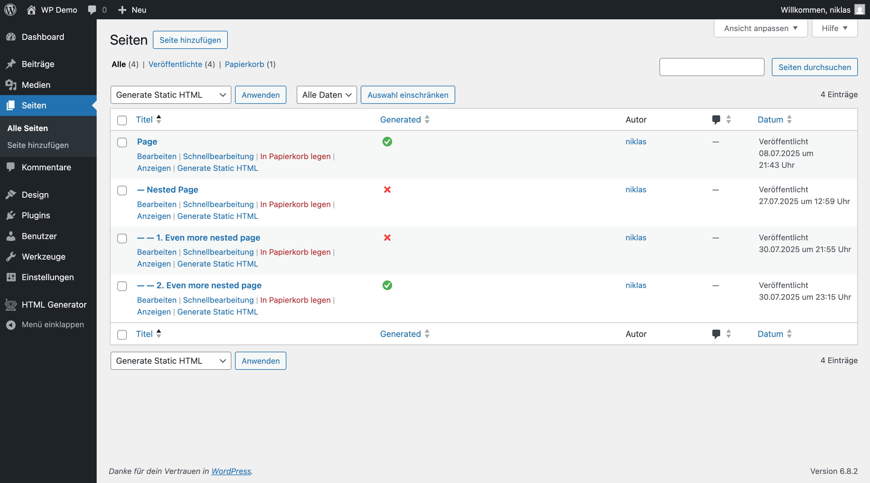 The plugin is built to integrate flawlessly with your existing workflow. HTML files are automatically regenerated whenever you update a post or page, ensuring your content is always up to date. For maximum convenience, you can manually trigger the generator for individual pages or use bulk actions to convert multiple pages at once directly from the post list. You can even see the status of your static files at a glance with the integrated status column.