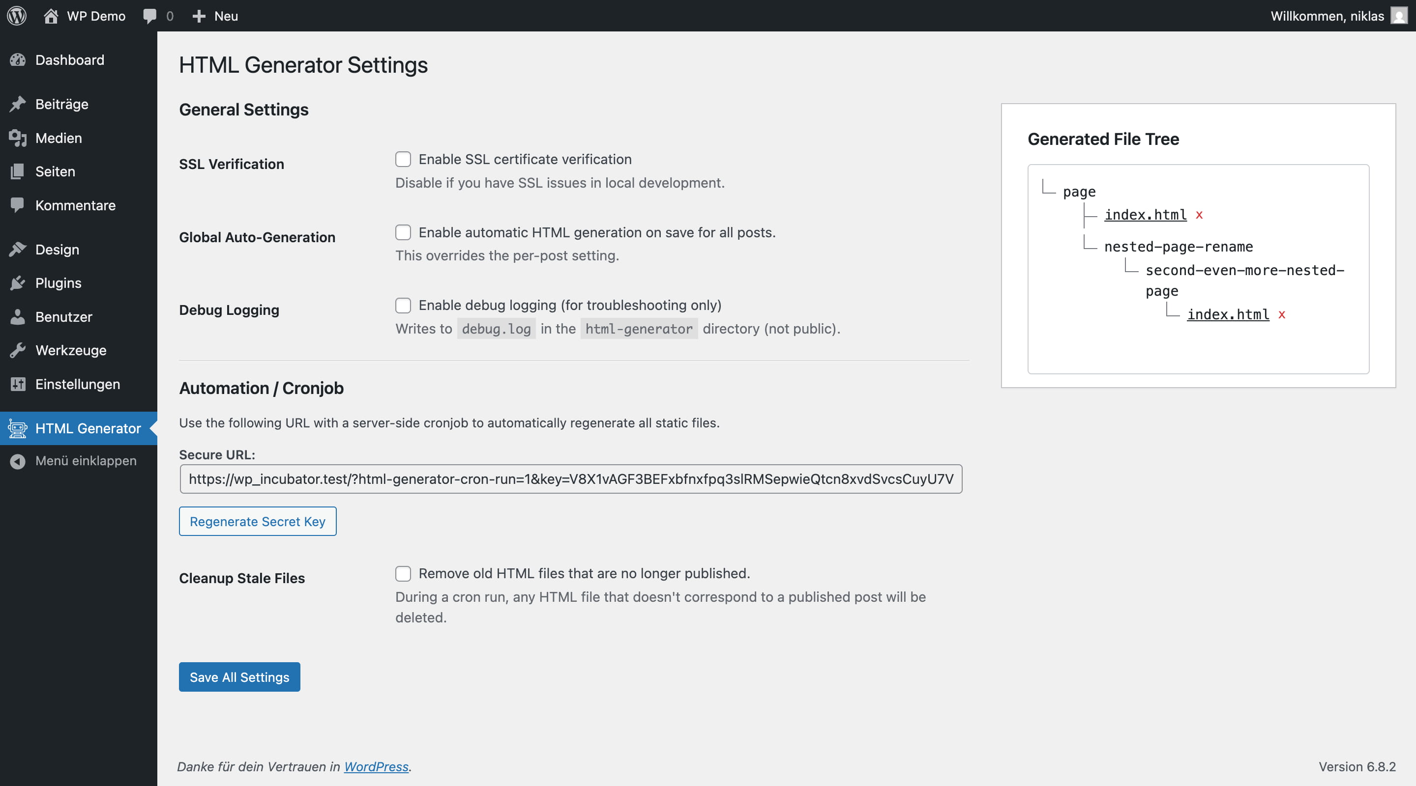 The HTML Generator provides a dedicated admin page where you can manage all your static files with ease. Generate or delete all files with a single click, or handle them on a per-page basis. The plugin also supports scheduled generation via cron jobs, giving you full control over when your static files are created. It’s the perfect “set it and forget it” solution for any performance-oriented website.